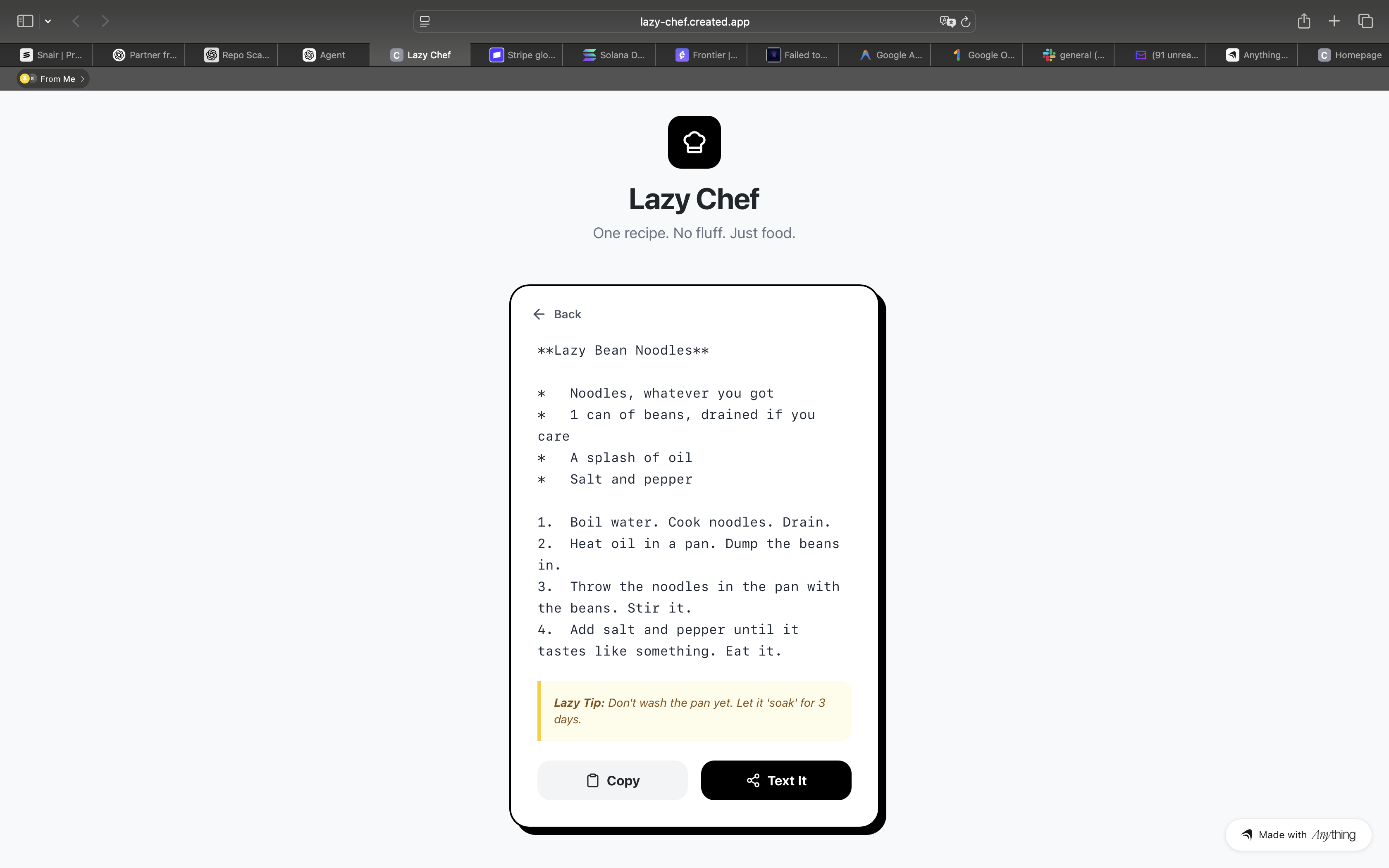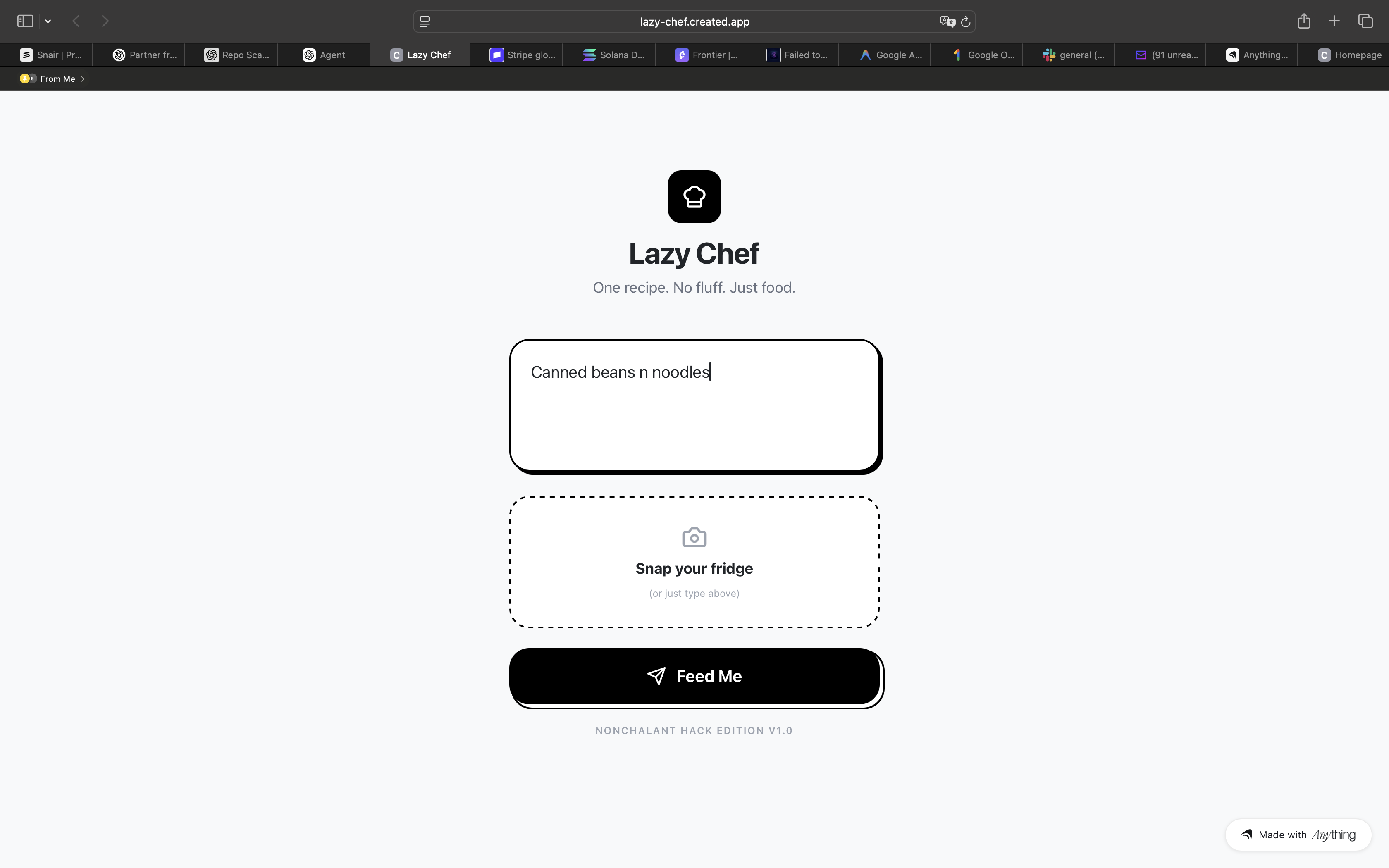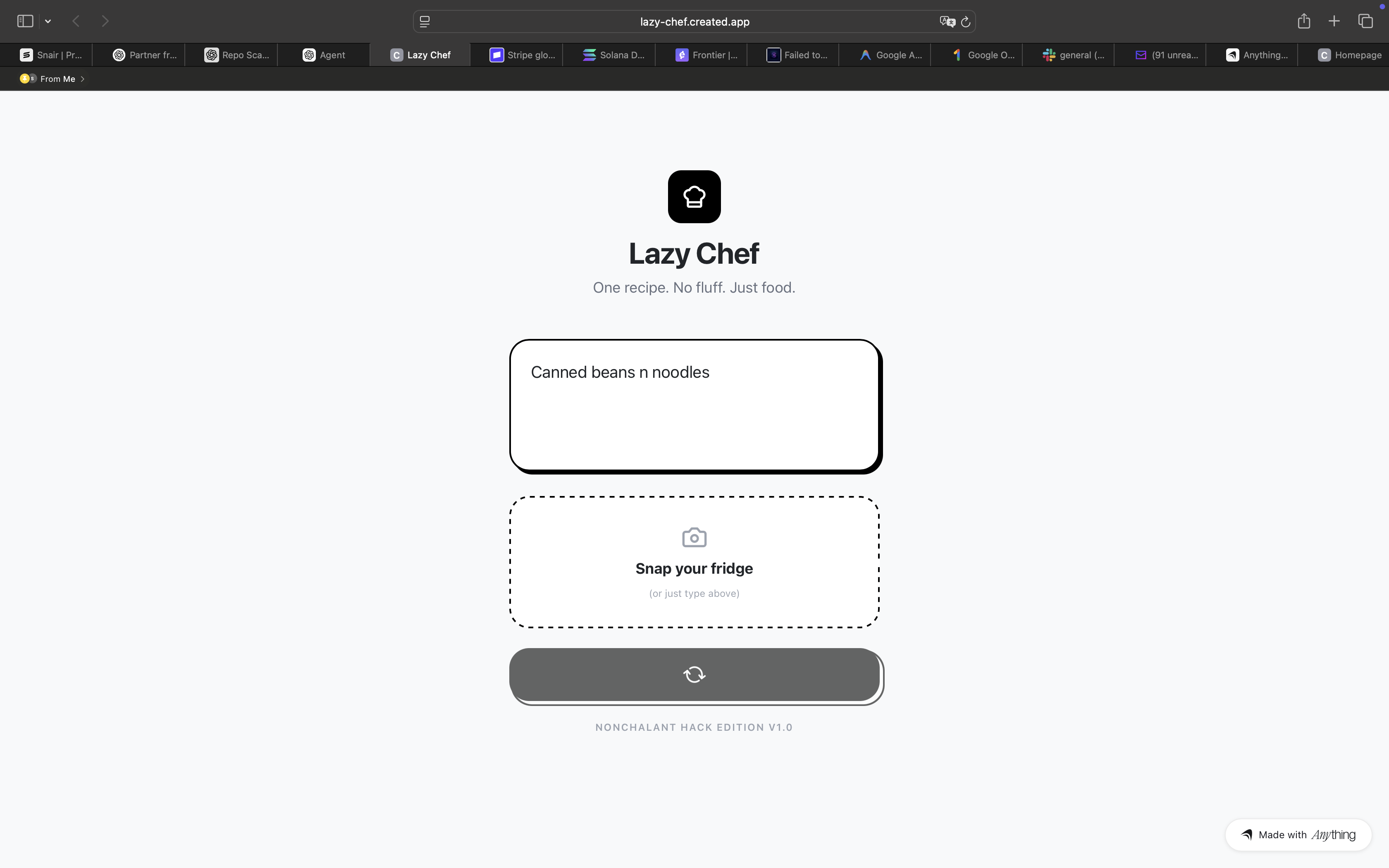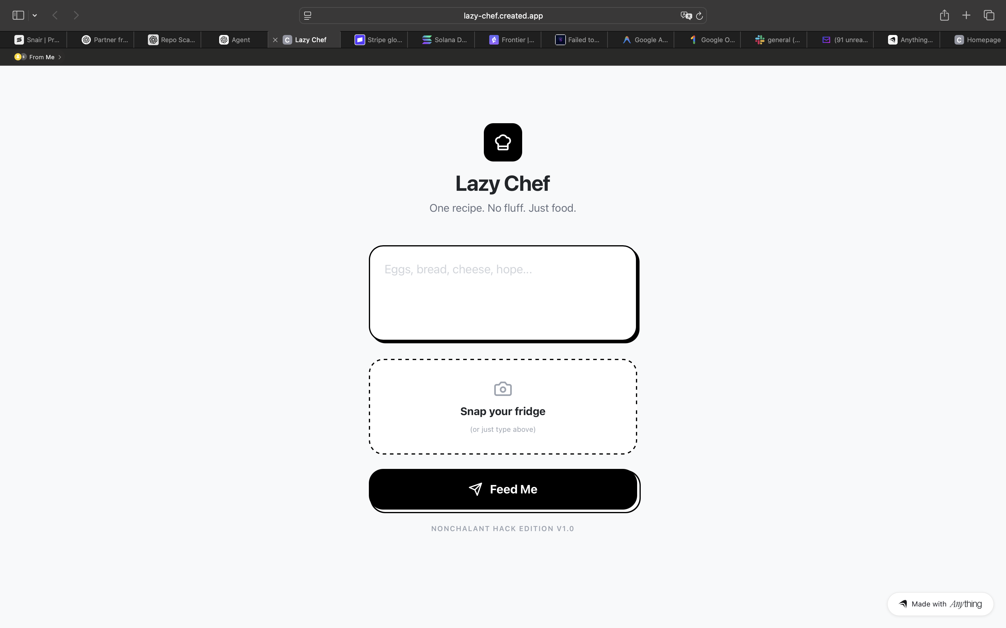 Built for people who want to eat well without the decision fatigue. Whether you're a student, a busy parent, or just someone staring at a half-empty fridge — Lazy Chef just works. Started as a one-text hackathon build, won Best One-Shot App at the Nonchalant Hack, and now evolving into a full subscription product.