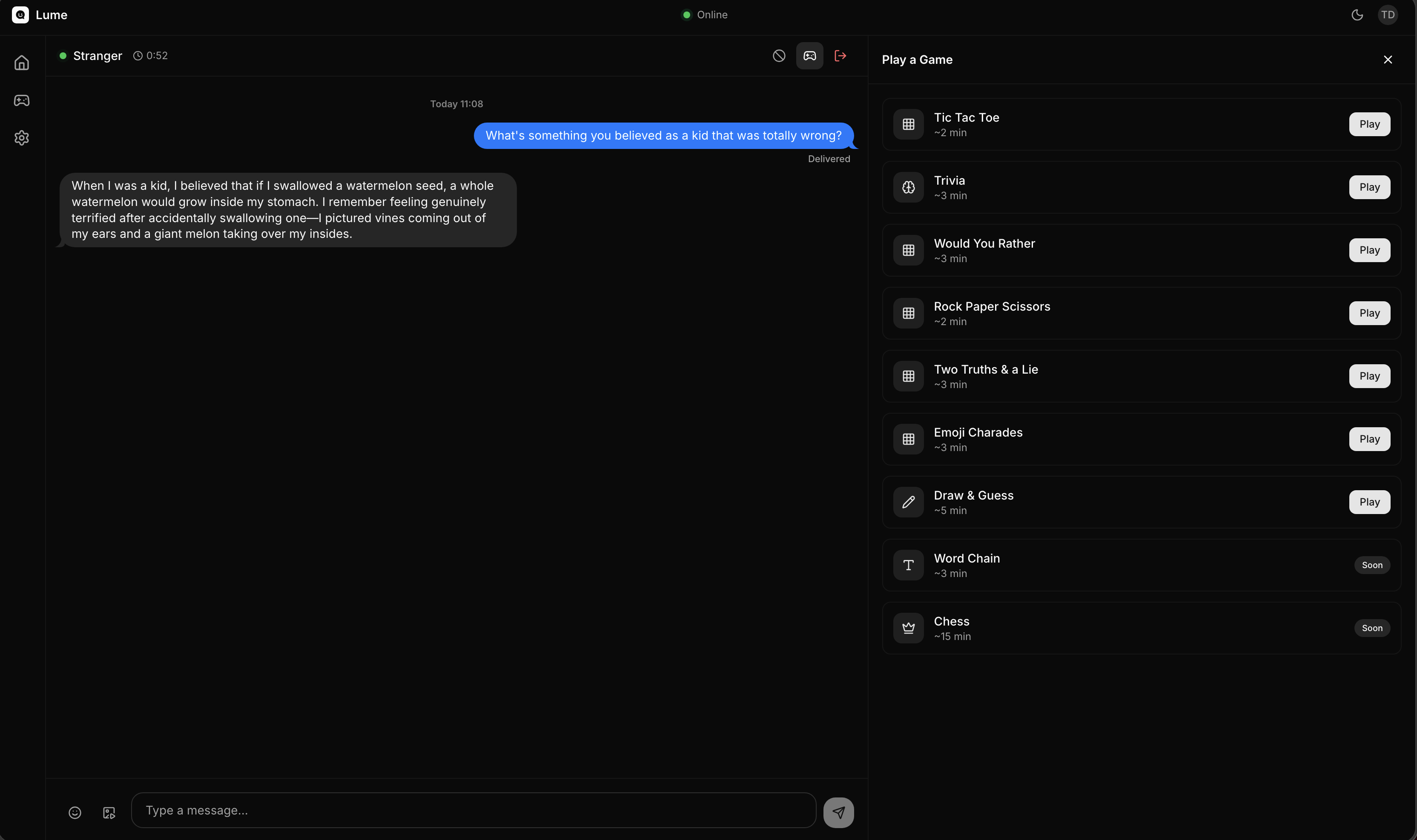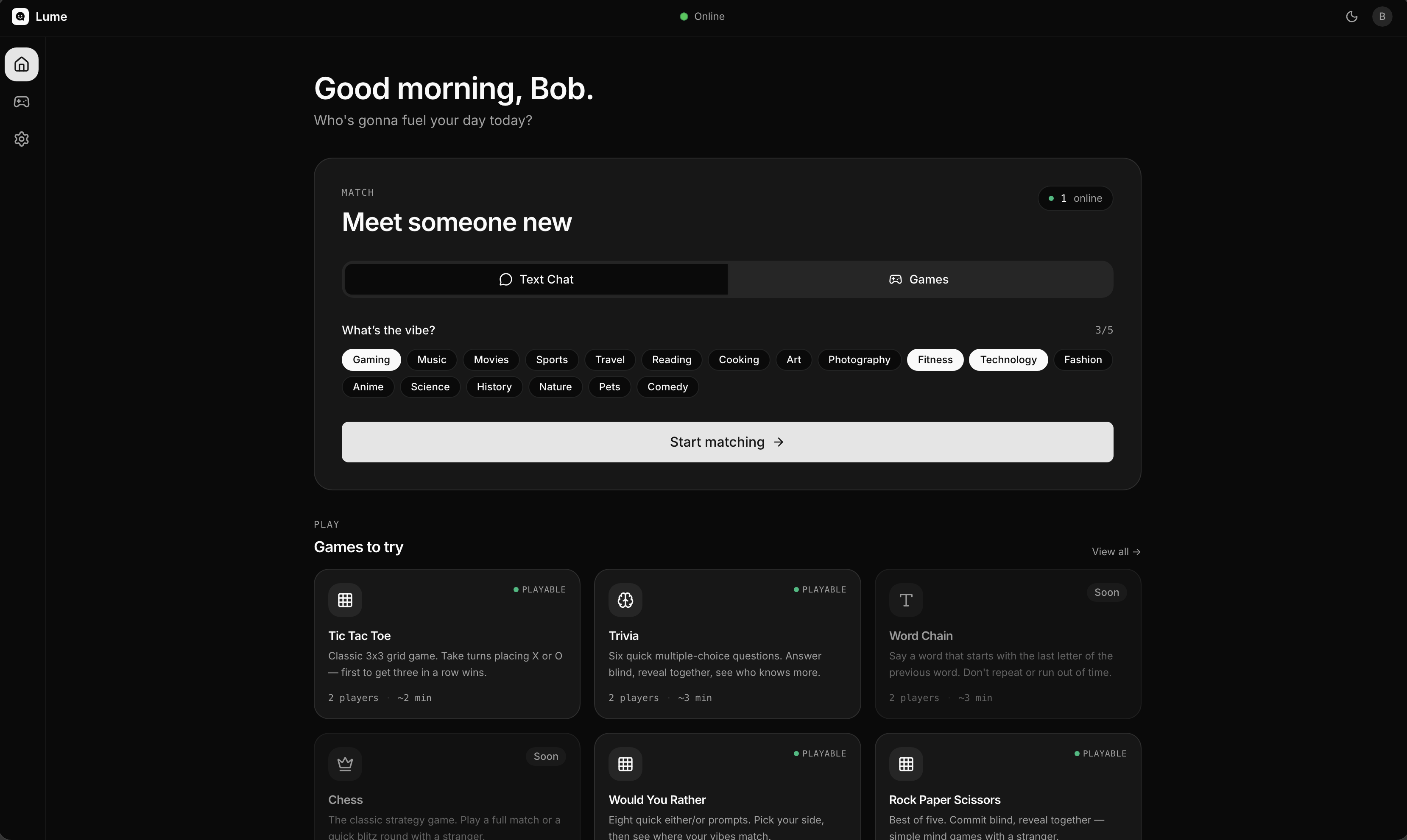 ↗ Read full postLume is a social platform for meeting strangers through real-time text chat and lightweight multiplayer games. It is a safer, game-forward alternative to Omegle — ephemeral text chat (messages are never stored), interest-based matchmaking, an 18+ age gate, and first-class reporting / blocking.