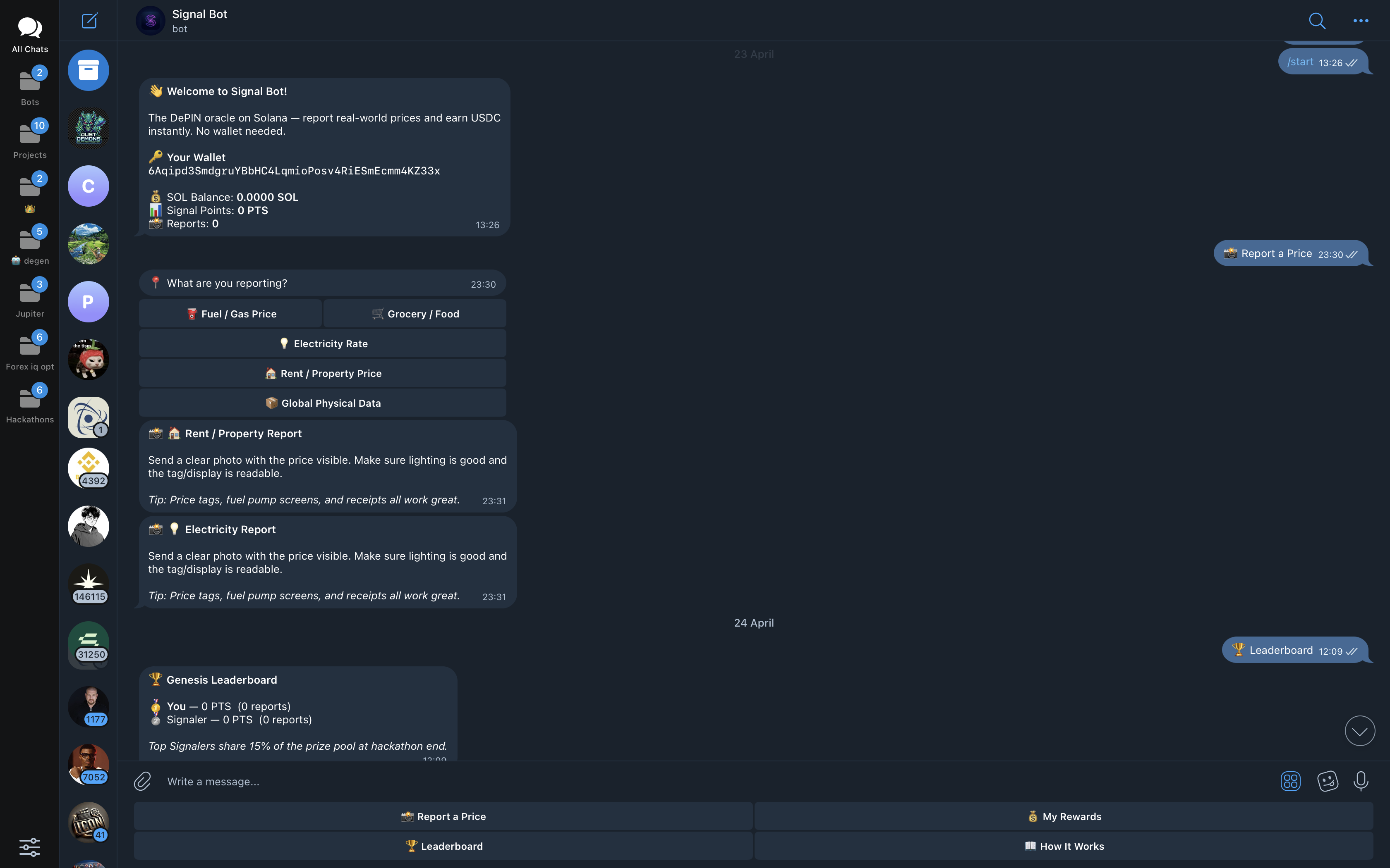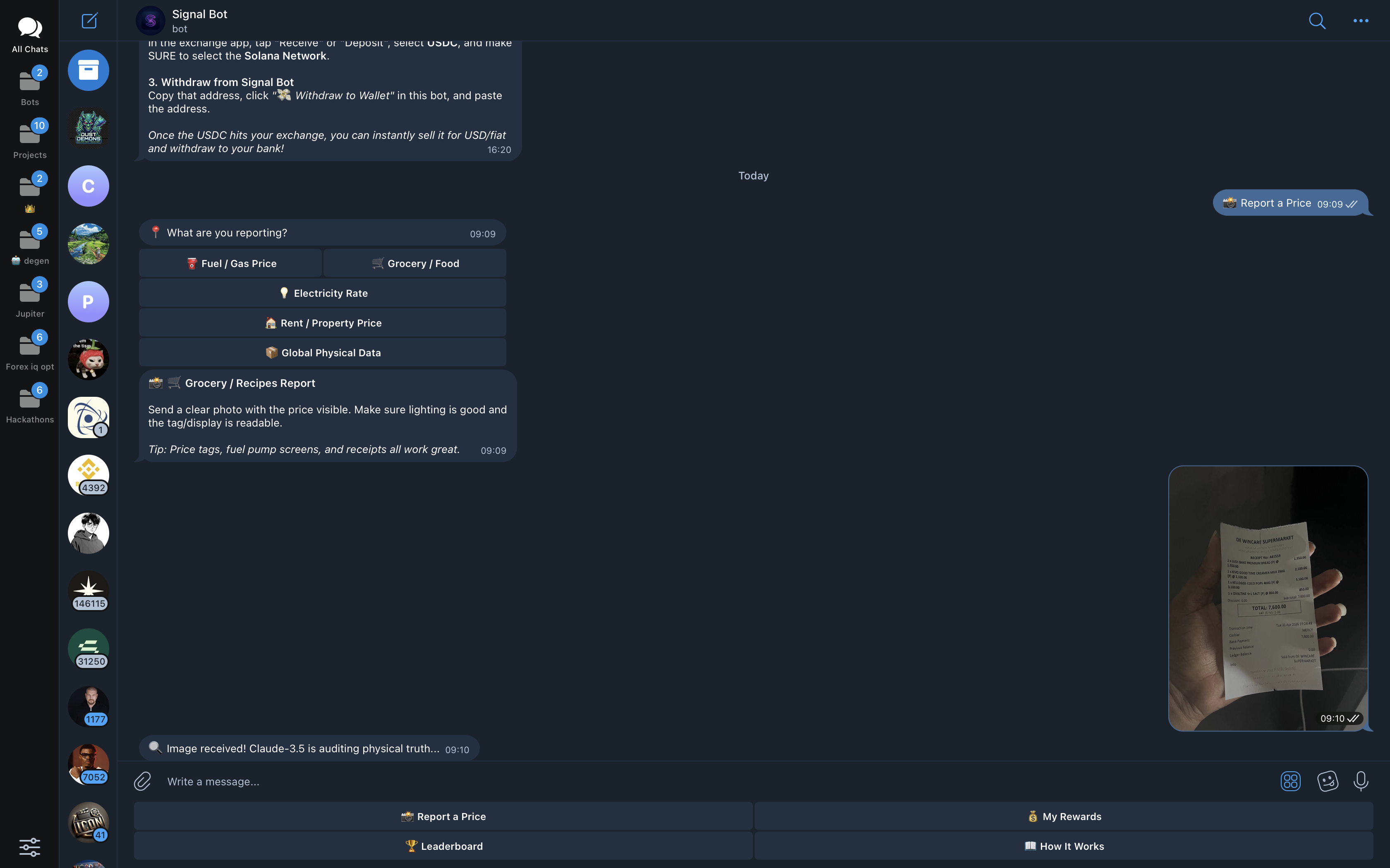 Anyone can report real-world physical data (e.g. gas prices, rent, groceries) by snapping a photo directly in our Telegram bot—no app download or wallet setup required. Claude Vision AI authenticates the data, and users are instantly rewarded with USDC via MagicBlock private transfers. Users can then 1-click auto-stake their earnings into Jupiter Exchange for yield.